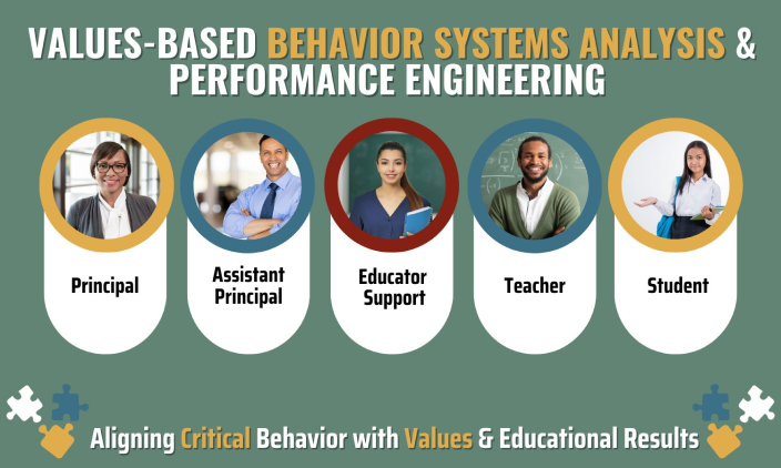 In this analysis and planning session, participants will be walked through key processes for assessing values and current behavioral systems structures as they relate to measuring and positively increasing behavior and performance to achieve goals. As part of these sessions, participants will be coached through identifying key results and using a values-based results-behavior alignment map to pinpoint and align critical behaviors required to produce important educational outcomes.